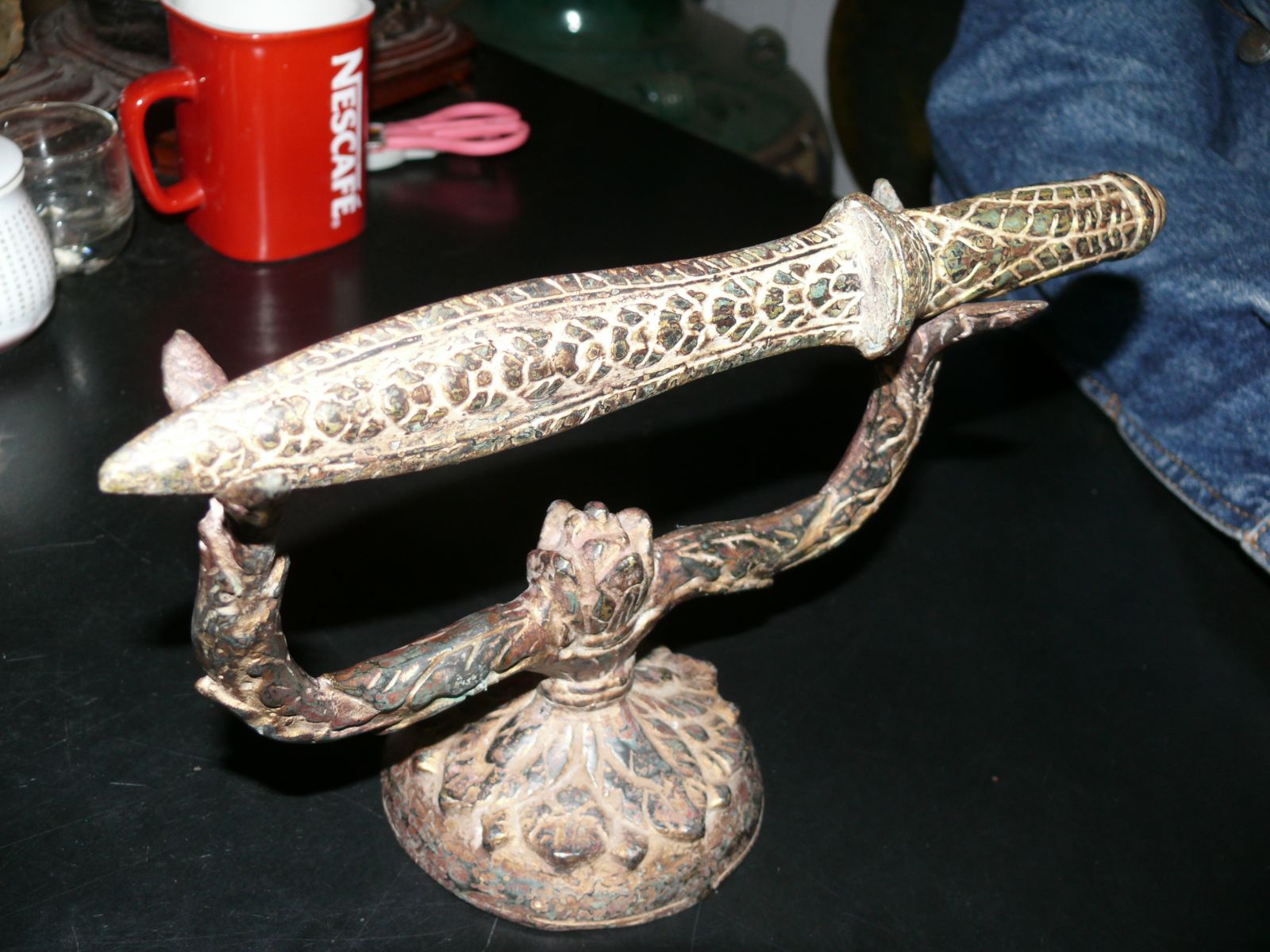 Con dao đặc biệt được ông Thanh gọi là “kiếm lệnh” của vua Chàm. Theo quan sát của chúng tôi, “kiếm lệnh” có 2 phần con dao và chiếc giá đỡ, dao và giá rời nhau. Dao hình bầu dục dài 25cm, bề ngang rộng nhất 3cm, chiếc giá đỡ cao 13cm, đế giá hình tròn. Tất cả thân dao và giá đều in hằn hoa văn mang nét của người Chàm. Ông đưa cho tôi cầm thử, chiếc dao nặng đến khó tưởng so với kích thước khiêm tốn của nó. Toàn bộ “kiếm lệnh” được đúc bằng chất liệu đồng nguyên chất, bên ngoài mạ vàng. Theo ông Thanh, con dao này mang tính biểu tượng về quyền thế giống như ấn kiếm của vua chúa thời phong kiến Việt Nam nhiều hơn là sử dụng thường ngày. Bởi lưỡi nó không sắc, trong khi toàn thân được mạ một lớp vàng mỏng và chạm trổ nhiều họa tiết rất lạ.